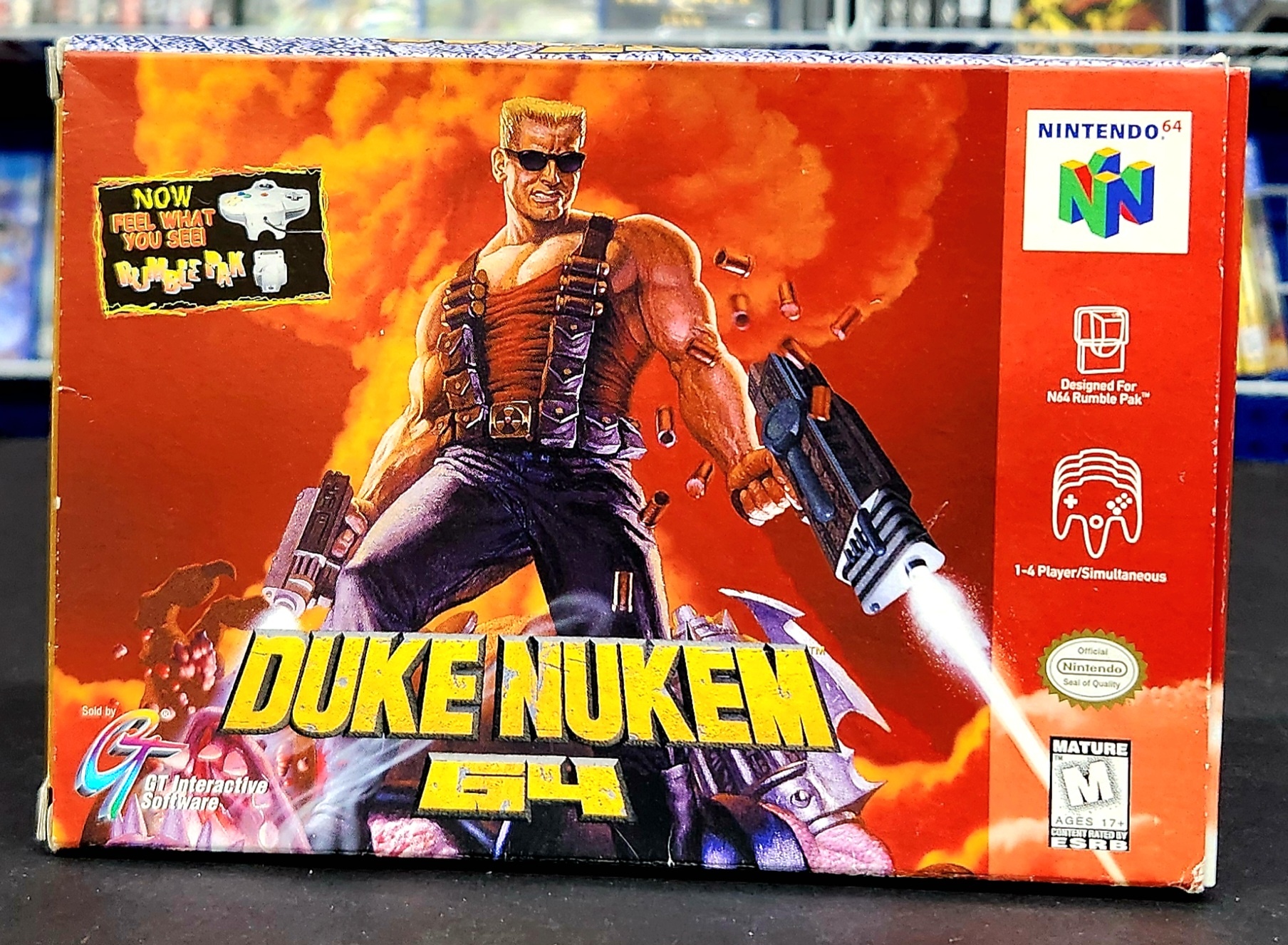 Duke Nukem has been ridding the world of alien scum for some time now on the PC, so his move to the Nintendo 64 was highly anticipated. The result is a nearly direct translation of the infamous PC game to the N64. The entry is a welcome one, since Duke injects a healthy amount of politically incorrect humor into the painfully serious first-person shooter market. Gamers shoot their way through a variety of levels modeled after real-world locales, such as movie theaters and office buildings. The action is fast and bloody, courtesy of your arsenal of powerful weapons. Call us crazy, but we especially liked the grenade launcher. This weapon shoots delayed-fuse projectiles that can bounce around corners to dislodge lurking enemies. When you tire of the single-player levels, you can partake in a fun deathmatch with up to three other players. Thanks to some adept computer-controlled “Dukebots,” you don’t even need to round up any friends to enjoy this portion of the game. Game cartridge is in good condition.